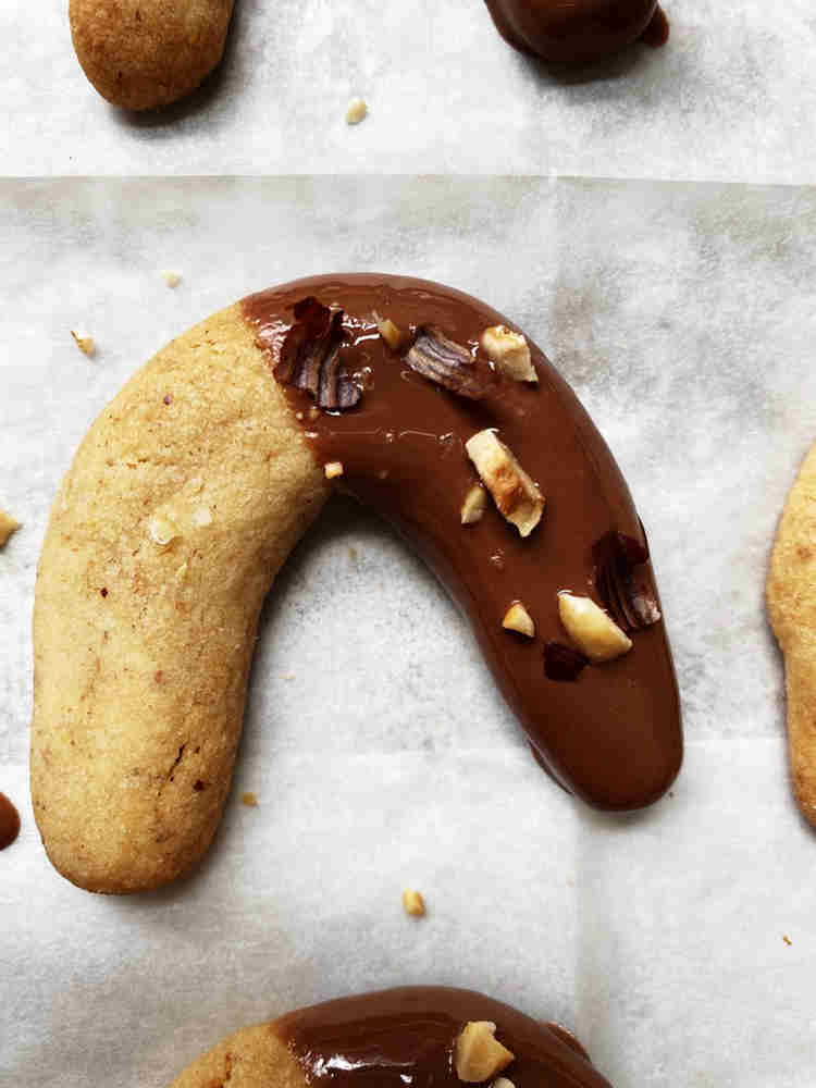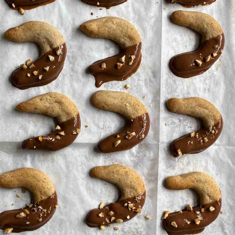 טובלים כל מחצית עוגיה ומפזרים אגוזים.